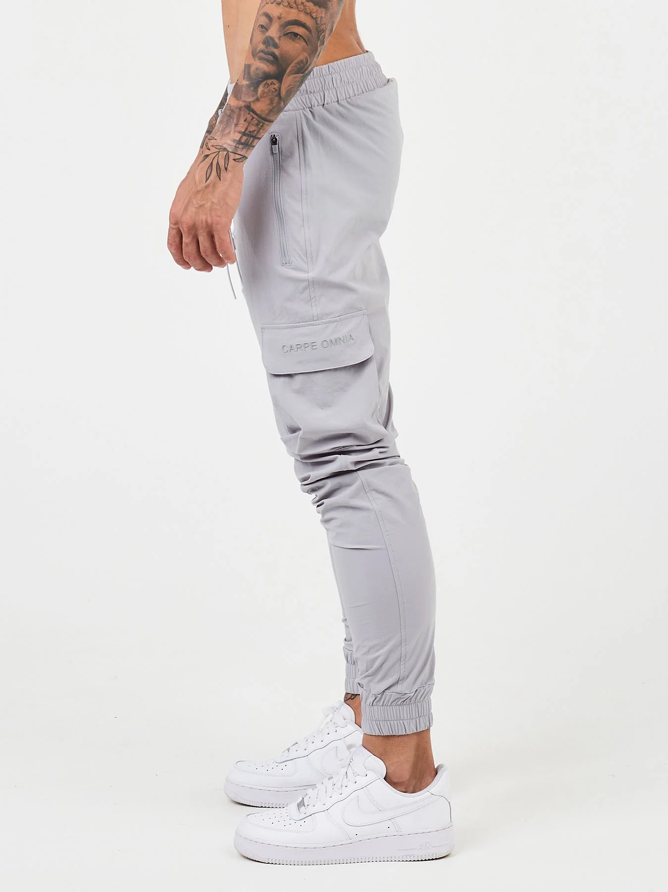 Light Grey Lifestyle Nylon Cargo Pants with CARPE OMNIA Pocket.